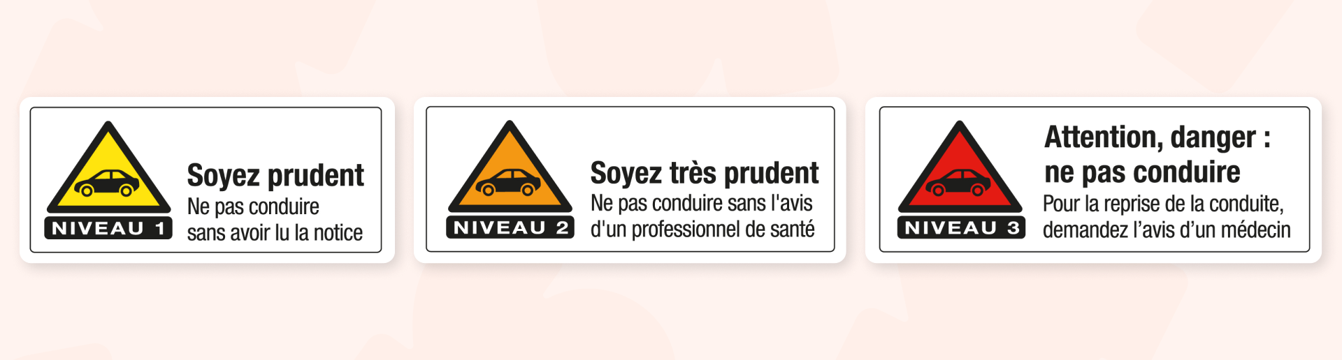 - couleur rouge (niveau 3) : signifie que la conduite est jugée dangereuse et demande l’avis d’un médecin pour pouvoir être reprise.